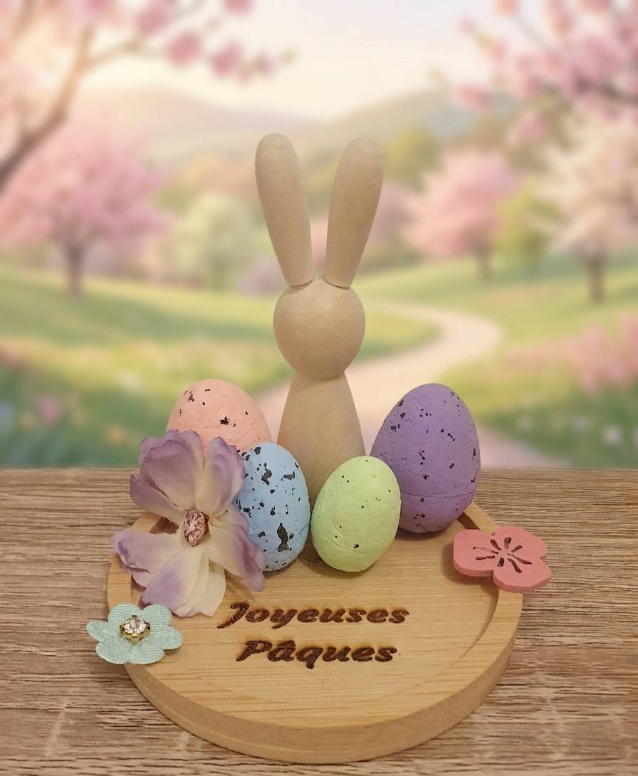 🌸 Décoration de Pâques – Lapin et œufs pastel 🐰🐣 Apportez une touche de douceur et de poésie à votre intérieur avec cette adorable décoration de Pâques artisanale. Au centre, un petit lapin en bois au style épuré et naturel veille sur de jolis œufs décoratifs aux couleurs pastel (rose, bleu, vert et violet), évoquant la fraîcheur et la gaieté du printemps. L’ensemble repose sur un socle en bois gravé « Joyeuses Pâques », délicatement décoré de fleurs qui ajoutent une note tendre et printanière. Cette composition simple et harmonieuse crée une petite scène pleine de charme, idéale pour célébrer Pâques avec élégance. ✨ Parfait pour : décorer une table de fête embellir une étagère ou un meuble au printemps offrir un petit cadeau original et plein de douceur Avec ses couleurs pastel et son style naturel, cette création apportera une ambiance chaleureuse et printanière à votre décoration. 💝 Une jolie attention décorative pour célébrer la magie de Pâques et le retour des beaux jours.