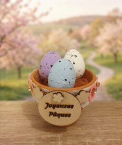 🌸 Pot en terre cuite décoré – Spécial Pâques 🐣 Apportez une touche de douceur printanière à votre décoration avec ce petit pot en terre cuite décoré à la main pour célébrer Pâques. Ce charmant pot est délicatement habillé de dentelle, de rubans et de petites touches décoratives qui lui donnent un style à la fois naturel, tendre et élégant. Il accueille trois œufs pastel mouchetés aux couleurs douces (bleu, lilas et crème), rappelant les teintes légères du printemps. À l’avant, une jolie médaille en bois gravée « Joyeuses Pâques » vient compléter la création et lui apporte une touche chaleureuse et authentique. ✨ Parfait pour : décorer une table de Pâques offrir un petit cadeau original embellir une étagère ou un coin printanier de la maison Chaque pièce est réalisée avec soin, pour créer une décoration pleine de charme qui évoque la douceur du printemps et la magie de Pâques. 💝 Une petite création décorative idéale pour célébrer les fêtes avec délicatesse.